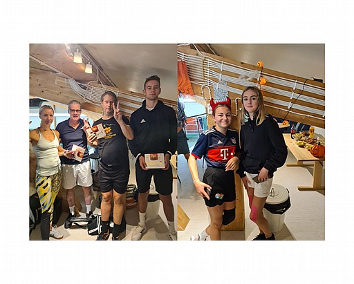 Bild till v:Vinnarparen i Höstlovsdubbeln. Från v. Moa Nord&Johnny Nilsson, Holger Sjöstrand&Hampus BM. Bild till h:Två av våra juniorer, Leia och Hilda, som klädde ut sig för Frenchgame turneringen.